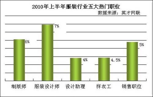 据英才网联旗下服装英才网最新统计数据显示,2010年上半年服装行业受行业复苏利好形势影响,人才走势大幅上扬,与去年同期相比人才需求翻了一番。其中需求量最大的五个热门职位分别是:服装设计师、制版师、销售职位、设计助理、样衣工。