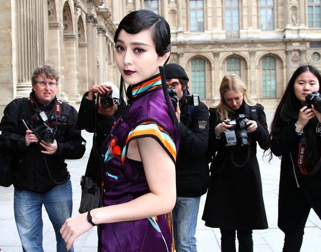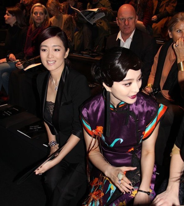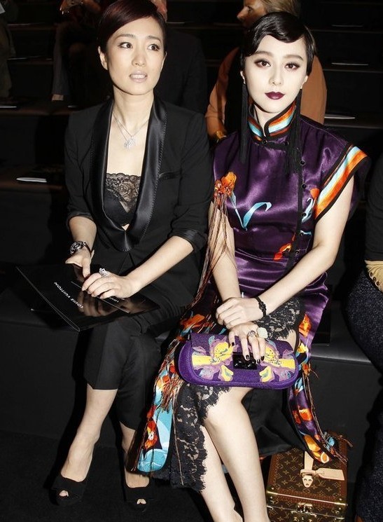 当地时间3月9日,2011年巴黎时装周(秋冬),路易威登(Louis Vuitton)秀场。中国女星范冰冰穿深紫色印蝶恋花图案旗袍现身,手拿精致手袋,化复古妆容展现老上海迷人风情,顿时艳压群芳。而在享誉国际的巩俐则是一身黑色装束,身穿蕾丝胸衣秀黑色时尚。两位中国美人还和LV的创意总监著名设计师马克·雅可布(Marc Jacobs)、LV总裁伊夫·卡塞勒(Yves Carcelle)纷纷合影,可谓倍受青睐。范冰冰还表示,巩俐是自己心中的女神,是真正的女王。范冰冰也是既巩俐之后在国际上冉冉升起的另一个中国女星,而如今在不同国际重大场合出入得风生水起的她,也算得上是和巩俐平起平坐了。