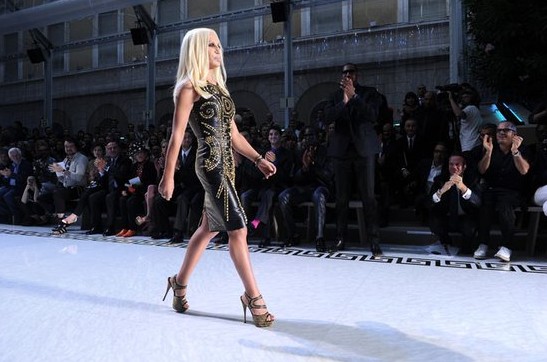 6月20日,Donatella Versace穿着一款Versace for H&M系列裙装出席Versace在米兰的男装时装秀
