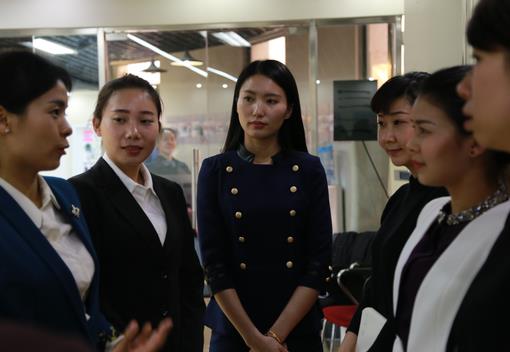 模拟演练教学是以组长模拟培训师,组员模拟受训对象,来进行蹲姿、走姿、站姿、坐姿训练的过程。在模拟教学演练中,徐老师帮助大家发现问题,解决问题,针对每一位出现问题的同学一一矫正。